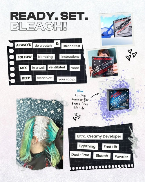 DIY hair bleach kits, designed to safely lift dark hair and prep your strands for vibrant, long-lasting, vivid color at home.Complete bleach kits that make Manic Panic® hair magic possible.